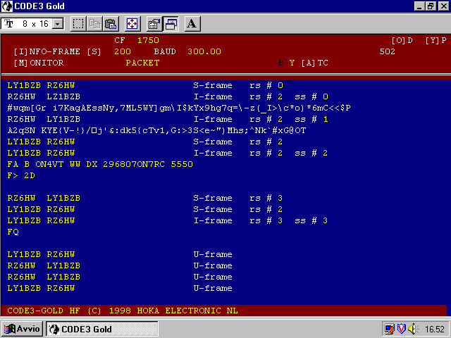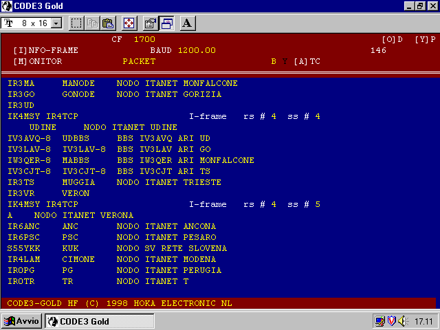 Versione radioamatoriale del sistema CCIR X25 ma con campi di indirizzamento estesi. La trasmissione è costituita da pacchetti di dati sincroni inviati alla velocità di 300 baud in HF e a 1200, 4800, 9600 baud in VHF. Ogni FRAME o 'pacchetto' è costituito da : una sequenza sincronizzata, un segnale di inizio, un campo di indirizzo, un pacchetto effettivo di dati fino a 256 caratteri in modo ASCII, un'informazione CRC, e un segnale di fine. PACKET AX.25 A mode used to allow data communications between PCs and dumb terminals. This system is typically used by radio amateurs, and to a lesser degree, United Nations organizations. Incompatible versions also exist and are in use by quasi-governmental organizations such as ICRC, UNHCR or IFRB. Typically the AX.25 protocol incorporates a modified CRC. On HF there are a few items to note. Typically 300 bd on SW. Data is arranged in packets of up to 256 bytes of 8 bit ASCII data. Each packet contains a 1 byte start flag, 3 byte address field, 1 byte control field, 0-256 bytes of data, 2 byte CRC and finally a 1 byte end flag. Packets are transmitted with no fixed timing. See the latest specification published by the American Radio Relay League (ARRL) for complete details on this system. There is also some 1200 baud PSK work done in the 10 meter ham band. ![]() ![]() |