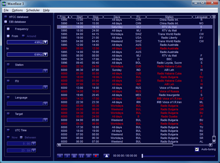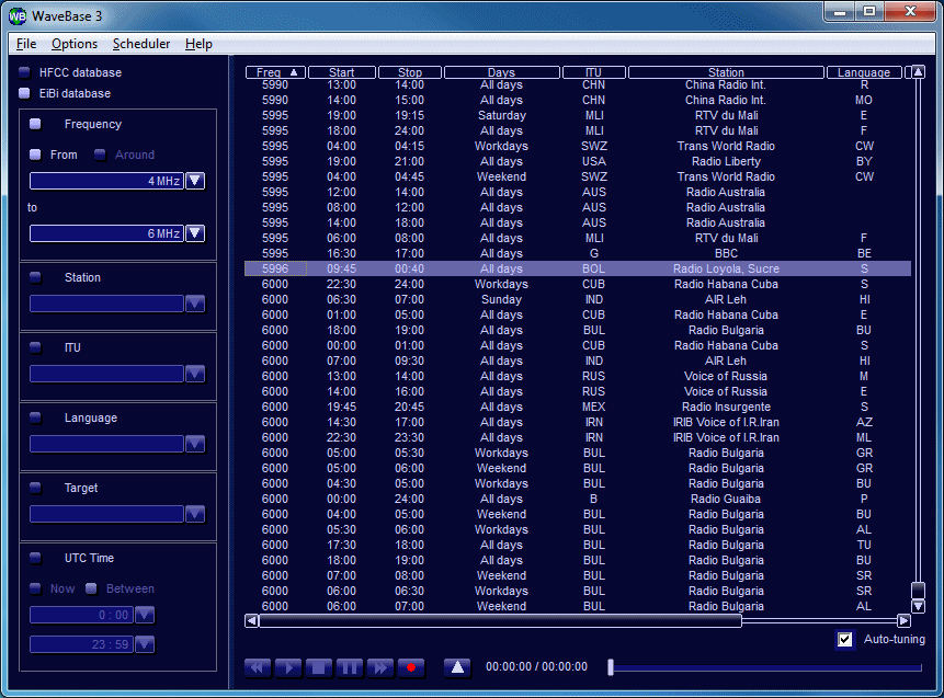WaveBase 3 makes it possible to easily import station frequency data and broadcast schedules from the Internet (HFCC and EiBi websites) to